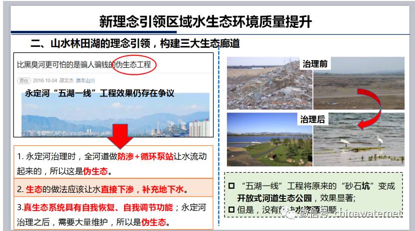 整治永定河建成五湖一线,但由于没有系统贯彻“山水林田湖”理念,遭到很多人的诟病是个伪生态工程。真正的生态系统应遵循自然规律,具有自我恢复、自我调节功能。