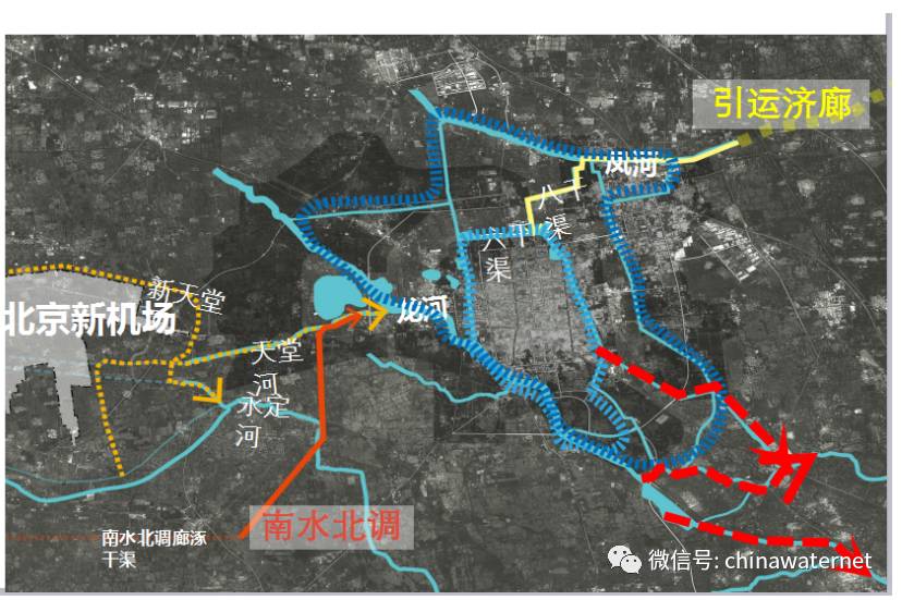 (2)联系外围水资源,增加水源保障,构建区域水安全格局。通过天堂河、南水北调、引运济廊联系外围水网,形成完整的区域水系统;