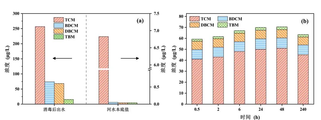 min后,四种三卤甲烷(THMs)生成量最高达257 μg/L(三氯甲烷/TCM)、74 μg/L(一溴二氯甲烷/BDCM)、68