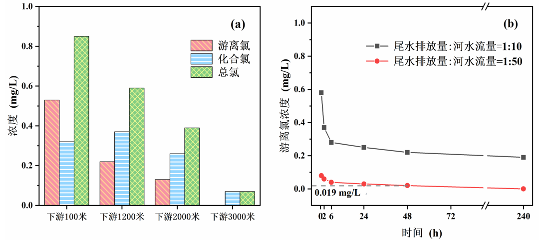 mg/L。由图4a可知,虽然总氯持续降低,但在下游3000 m处的浓度(0.07 mg/L)依然大于0.019