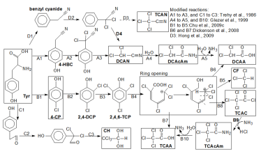 图10 芳香族氨基酸氯化生成消毒副产物的路径(Chu et al., 2012)
