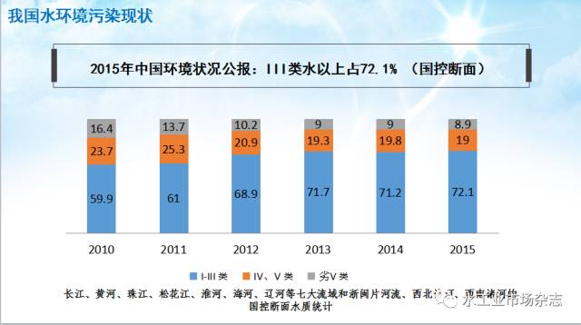 从图1可以看出,我国水环境存在的主要问题,从2010年到2015年中国环境公告来看,我国水环境、水体情况逐渐好转,III类水体占72%。但是也可以看出,治理成效不是很理想,进展还比较缓慢。