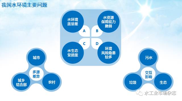 可以看出,上述问题和城市、城乡结合部、农村多元差异,以及污水、垃圾、生态交互影响,形成水环境四个主要问题,造成水环境质量差、水环境保障能力脆弱、水生态受到了严重损伤,而且环境风险和隐患开始多起来了。见图2。