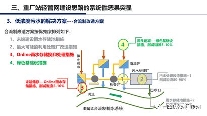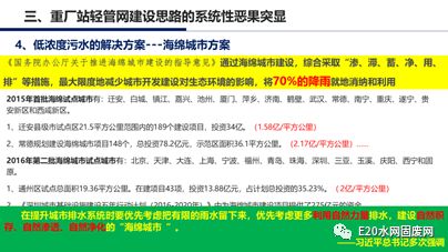 针对上述问题,首先来看分流制的解决方案。王凯军介绍,国际上,合流制大部分在19世纪得以解决,黑臭水体是国外一些国家100年前所面临的问题。其合流制管道截留倍数在10到20以上。此之后,还出现合流制的溢流问题,那么用什么方式解决?美国首先提出了用绿色基础设施的方式解决,后来绿色基础设施形成了低影响开发,是解决5%到20%的溢流量。目前的截留制与完善的合流制之间存在很大的差异。下一个问题是绿色基础设施,即海绵城市方案。