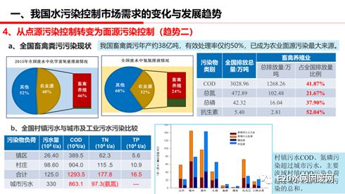 我国将经历从点源污染控制转变为面源污染控制的过程。如果在城市工业消减的情况下,统计结果显示,COD、总氮的负荷正逐渐增高,2015年畜禽养殖业COD排放量已达到40%以上。其中村镇污水的COD、氮、磷污染超过城市污水,主要流域村镇COD污染负荷超过城市生活和工业污染的总和。