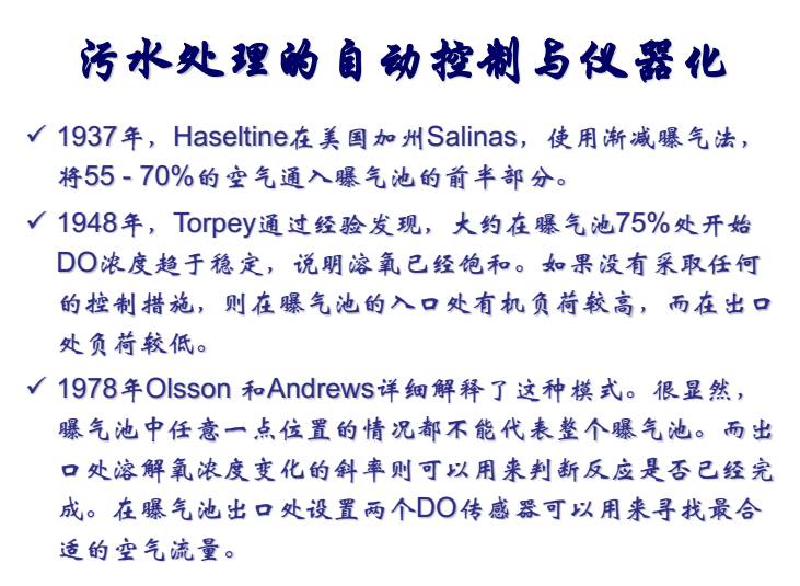 对污水处理的自动控制与仪器化的研究可以追溯到上世纪40年代,经过逐渐发展,70年代后期Olsson和Andrews根据污水处理原理对氧的需求进行详细解释,这是一个非常重要的贡献。