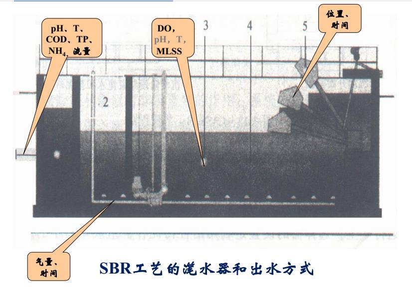 另外一个常见工艺是SBR法。SBR主要通过曝气来周期运行,一般要对进水进行监测,然后测MLSS和DO,滗水器要测位置和停留时间,还要对曝气量进行控制。在这种配置情况下,在池内不同位置因为水流的关系,DO浓度也是不一样,而SBR是靠DO来控制曝气的,所以要选择适当的位置对DO进行安装。