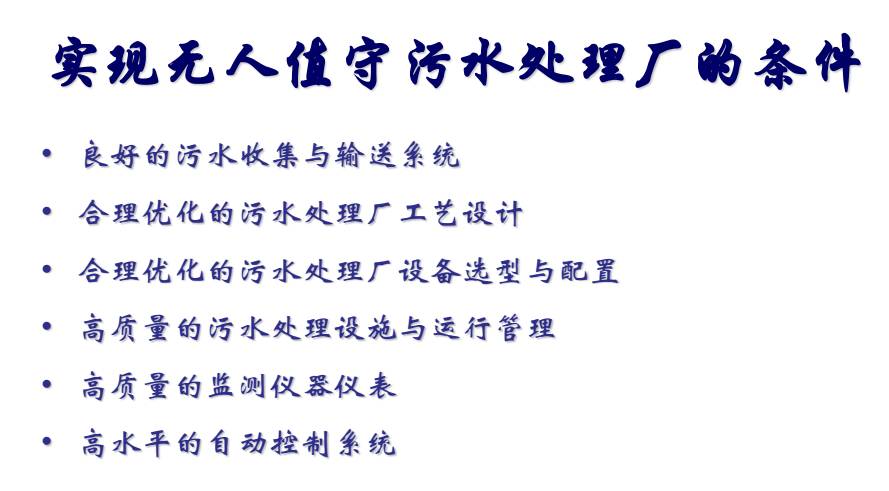 实现无人值守或者少人值守需要有以上这些条件。从污水处理行业整体角度来看,自动控制还处于初级阶段,单纯从技术上和财力上来说,一个小规模或中规模的污水处理厂都可以做到几乎无人值守,但是在建成投产使用之后,人员技术水平如果达不到,污水处理厂也是很难做到完全真正的无人值守。无人值守的污水处理厂的实现还有很长的路要走,衡量其必要性和使用范围是十分重要的。