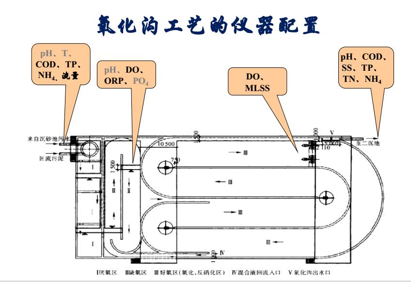 对于氧化沟来说,进水要装一些仪器,氧化沟里主要有DO和MLSS,在缺氧区有DO和ORP,出水区也有一些常规的检测。氧化沟的特点是水是循环的,水循环过程中,DO的一个停留时间里水可以循环十几圈,根据来水波动的不同,氧化沟里面能够形成一个缺氧的区域,这段时间氧化沟可以转十几次,此时氧化沟里相当于进行了一系列AOAO的脱氮的过程,能够在氧化沟里进行脱氮,这样的情况下,可以在氧化沟装MLSS和DO,在缺氧区装ORP,就可以在氧化沟里同时实现硝化和反硝化的效果。