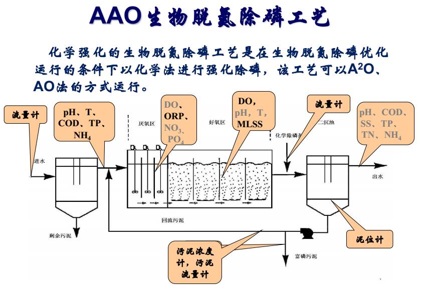 下面用三个基本的工艺为例来对仪器的安装位置进行说明。首先是A2O生物脱氮除磷工艺,在进水位置用流量计来测量流量和参数,在缺氧区测氧还原的速率,在好氧区测DO和MLSS。对于灰色标记的仪器没有硬性要求,可以装也可以不装。加药要加流量,要对出水要进行测试,还要考虑污泥量。剩余污泥排放和回流污泥要用MLSS计进行测试,这是A2O法的中等水平的容器配置。