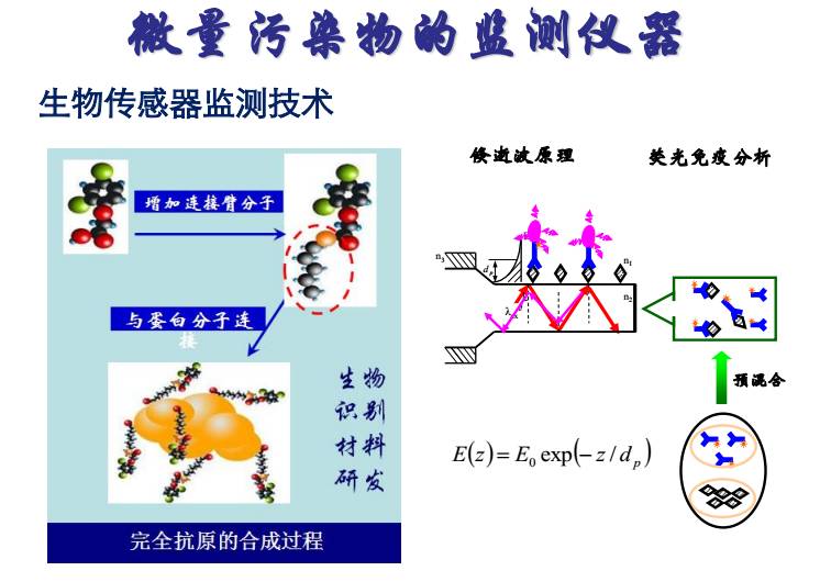 涉及到微量污染物时,通常用一些大型仪器来测定,但是这样的复杂仪器的缺点在于时间长、费用高,因此现在也发展出了用生物传感器为基础测污染物的技术,利用抗体对污染物的特殊识别能力可以对污水中的污染物进行测定,主要是基于激光技术原理,激光照射在光纤里可以在表面上产生很小的能量的光,称之为倏逝波,如果在表面修饰一些抗原,把水样和标记抗体混合以后会产生结合反应,结合反应完成后把它通到表面上来,这时剩余的抗体就会结合起来,这时候如果有激光进来的话,就会产生荧光,把这个荧光收集回去就可以得到和这个微量污染物相关的信息。