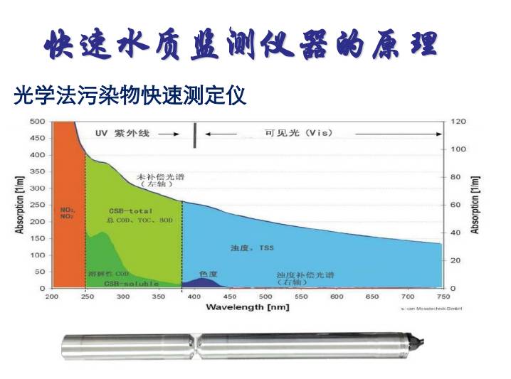 到上世纪末小型的光谱议出现了,水样测试是比较复杂的,因为水样中往往有浊度和色度,这些都在可见光的范围里,如果采用光学法,通过可见光将色度和浊度透过之后,可以得到比较准确的测定结果。