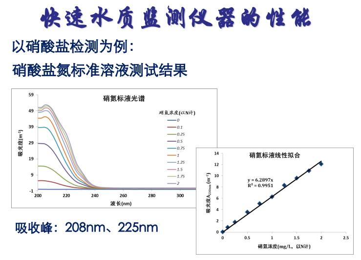 这是一个简单的光学仪器的结构,在测硝酸盐时,吸收峰280nm和225nm,在比较干净的水里可以做出比较准确的标准曲线,如果有COD和浊度的影响,仍然是可以分的出来的,所以光谱仪器已经较多应用于水环境监测了,经过本地校准后,能够得到很好的相关性。