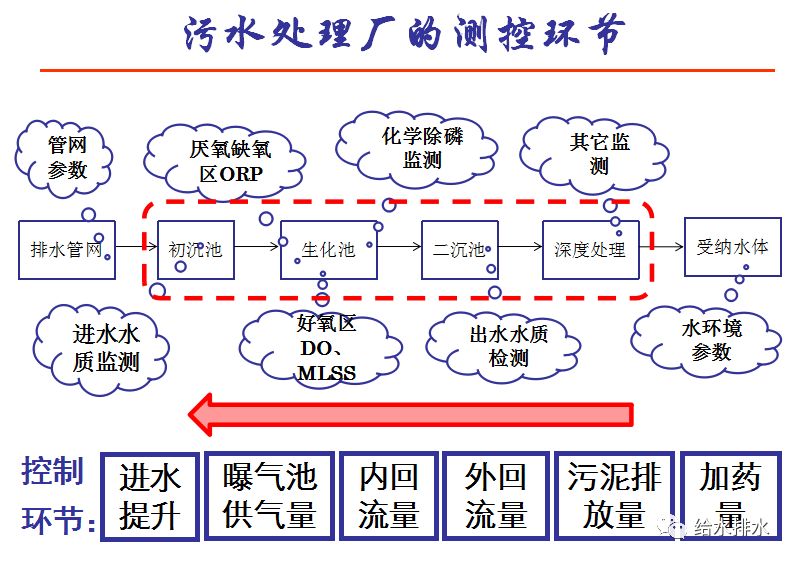 一般污水处理厂,从控制系统看基本就三大块。一块是预处理的控制,一块生物二级处理,再有一块深度处理。如果从排水管网末开始算,一直到污水处理厂一级处理二级处理和深度处理到硝化水体,要测和控的环节并不多。