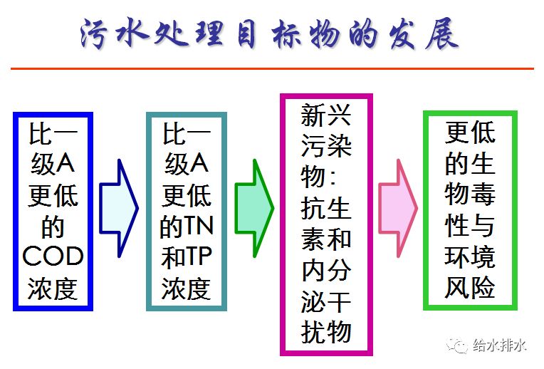 从污染处理目标物的发展来看,原来主要是去除COD和氮磷,现在关于环境风险还要加上新兴污染物包括抗生素和内分泌干扰物,最终要考虑安全,还有生物毒性和环境风险。