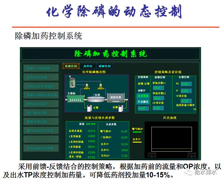 如果说要降低曝气能耗,可以做溶解氧的测试、风机控制等。加药控制,加药量降低15%到10%,降低药剂经济效益。
