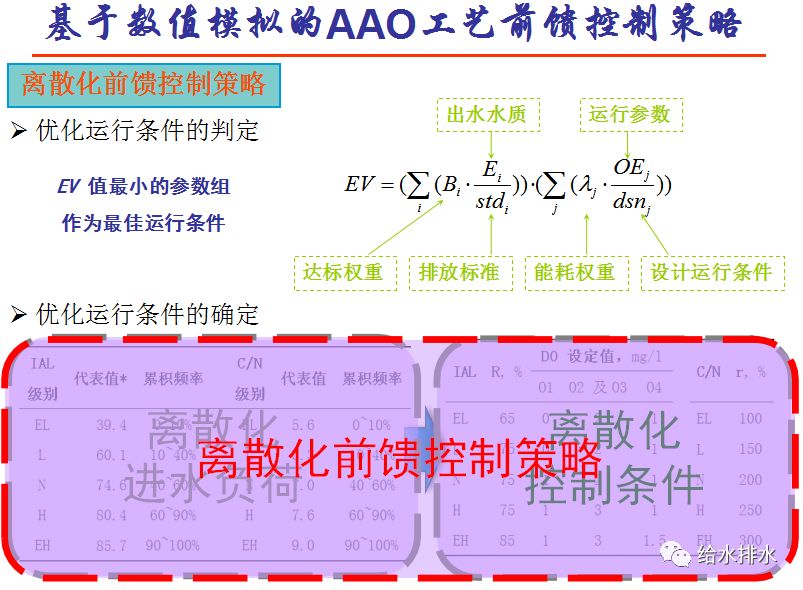 经常有人问ICA的控制模型能不能用在污水处理上。ICA是很好的原理模型,但是很复杂,这样的模型不能直接用在污水厂的PRC控制,我们现在用的PRC控制系统没有这么强的计算能力,用IAL模型,可以做运行的条件,有了运行条件以后,将其离散。污水厂实际的调整不是实时在那不断调,按点调不可能,所以离散化变成阶段条件,一段负荷是一个运行调剂,形成离散负荷条件。根据离散负荷条件,做出离散运行因素条件,这样形成控制模型。这个模型按照常理的POC,这么多年我们基本做的这样一种模型。