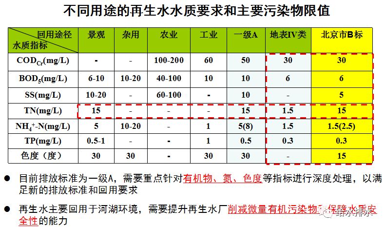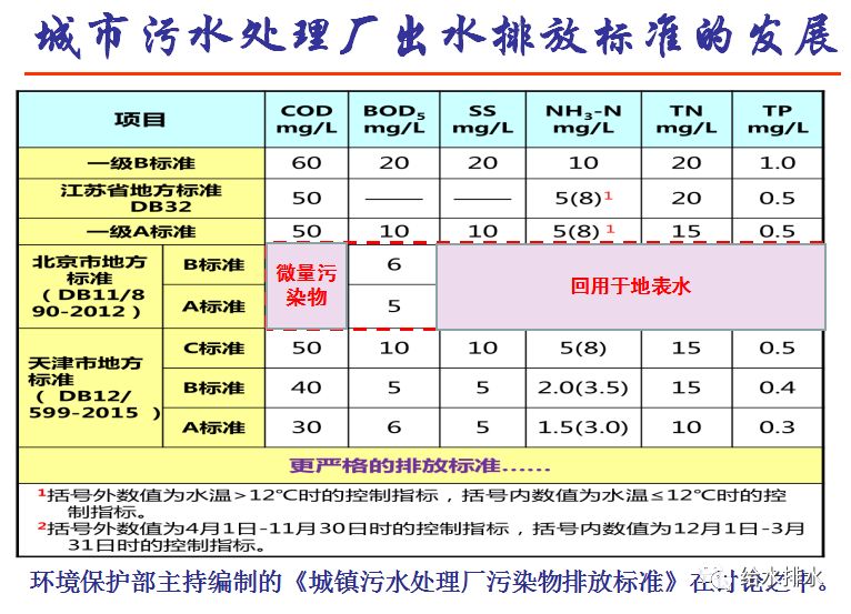 长期以来,不断有一些新的排放标准推出,包括原来2002年推出的GB18918标准,还有地方标准严于国家标准的情况,原来一直说国家标准是一刀切,可现在北京、天津、江苏、合肥的地方标准都比国标还高。这些标准里,氮磷控制比原来一级A要严,COD也从一级A的50降到30甚至20。从环境风险和环境健康角度去看,这部分其实除了对有机物耗氧考虑,还有微量污染物的环境风险考虑。之前一级A的标准是为了满足再生水的要求,现在新的再生水标准也在制定之中,会进一步推进我们水处理技术发展。