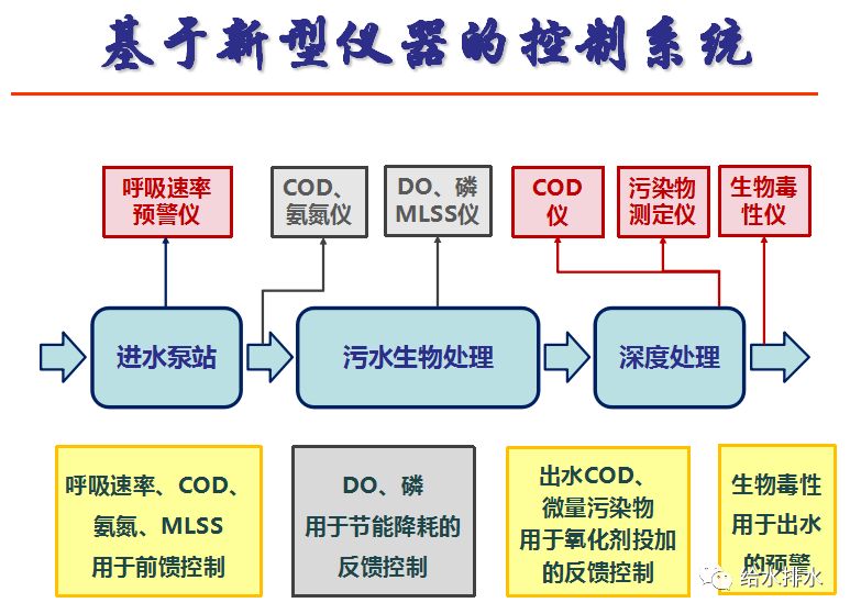 在进水有呼吸速率的仪器,对进水监测仪器,可以通过呼吸速率、氨氮等等给出更好的控制条件。污水生物系统上,有溶解氧还有污泥浓度,用来指导曝气的控制。出水末端磷酸盐浓度和流量指导加药。深度处理里面,我们可以有COD在线测定仪,污染物的在线测定仪,这样给出深度处理里边的污染物和COD的量,可以用于控制深度处理里边氧化剂的投量。氧化抗生素很有效,去除50%以上。氧化剂也是用电比较贵的,我们控制也是节约投加量。最后出水端,有生物毒性的监测,把关有没有风险。