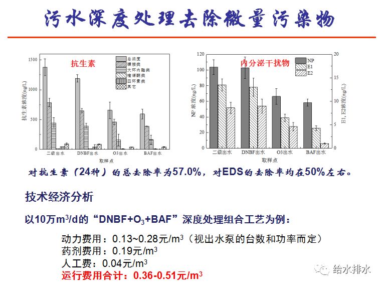 以江苏某厂为例,进水COD浓度在200、300mg/L,TN浓度在30、40mg/L条件下,出水TN浓度可达到10mg/L,COD可以小于30mg/L。微量污染物方面,对于24种抗生素,测定可以达到57%的去除率,对内分泌干扰物也可以达到一半以上。当然这样的深度处理会增加成本,根据水质的不同,运行成本的增加大概在每吨水0.3~0.5元的水平。