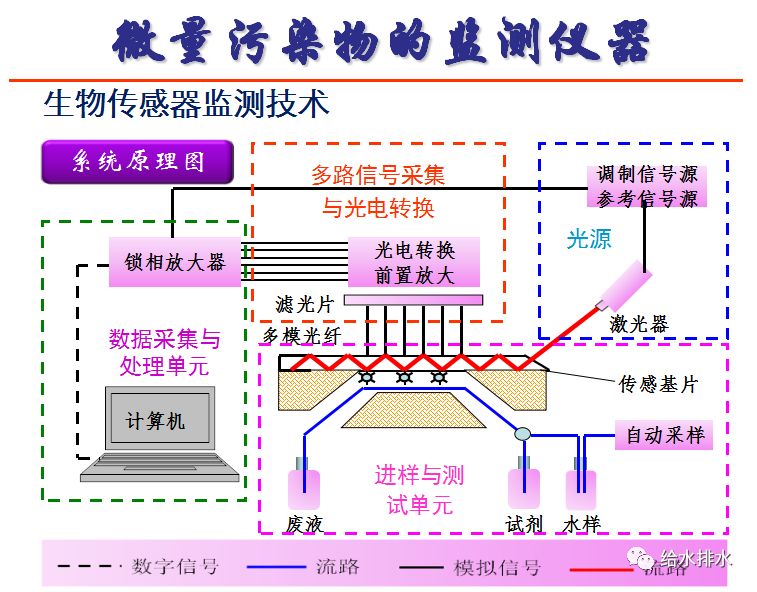 微量污染物可以用生物传感器监测技术,在芯片表面,激光镜产生V的能量,芯片表面消失了敏感物质,进来的水样经过,比如说抗体和核算标记的进行反应,反应以后流过界面,表面就会把这些污染物识别的材料固定,固定以后,如果有激光进来就会发生荧光,荧光可以被测定。