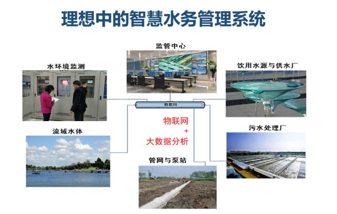 施汉昌认为,理想中的智慧水务是这样一个系统:从饮用水源和供水厂开始,产生的污水进行处理,处理后的污水通过管网和泵站输送,流入受纳水体。但这个过程中,不能给受纳水体造成生态上的安全隐患,所以要搭配水环境监测站,把数据通过物联网送到监管中心,之后利用大数据来分析已经获得的大量信息,最后确定排除隐患所要采取的措施。
