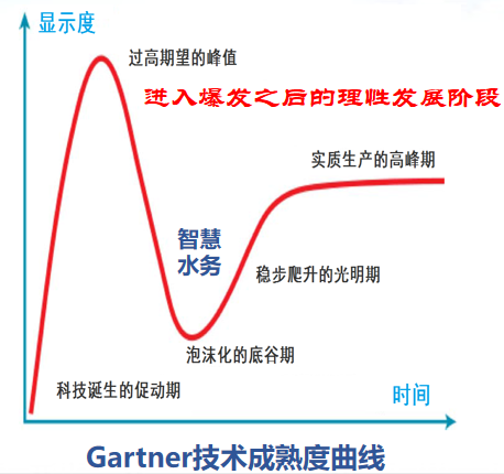 2018年,受到经济大环境的影响,智慧水务的发展速度稍有放缓。到了2019年,智慧水务的发展热度逐步得到恢复,达到一个平稳的状态。施汉昌认为,这符合任何一个新的科技技术的推广规律。从国际上通用的Gartner技术成熟度曲线可以看出,智慧水务在经历了泡沫化低谷期后,逐步进入到平稳发展状态。