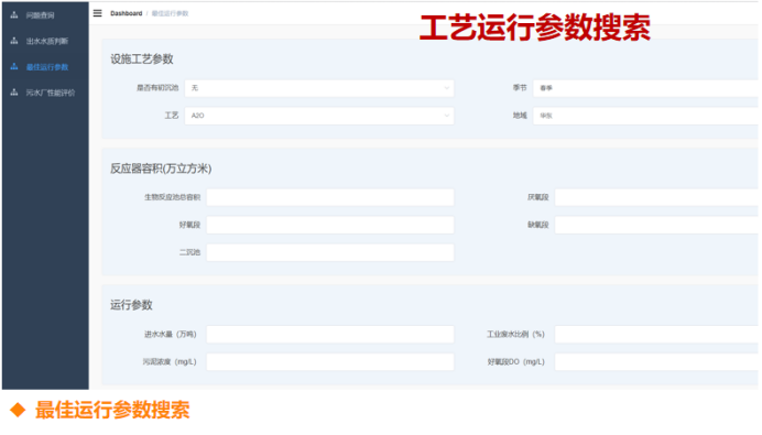 工艺运行参数搜索界面,可以搜集多个厂的数据,放在数据库中,通过对进水的情况判断,就可以通过搜索把能够达标的运行条件提供出来。如果对于单厂有足够的历史数据,也可以做成数据集,从中搜索该厂能够运行达标的条件,从而指导污水处理厂的稳定运行。