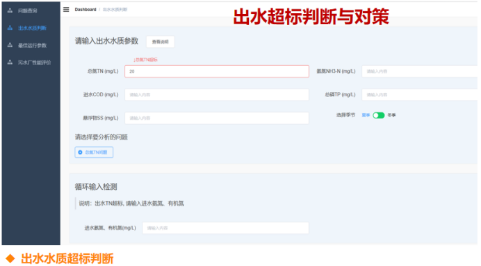 之后将出水水质等数据输入出水水质判断页面,就可以判断水质是否超标,如果超标,就会进一步分析超标的原因,以及针对问题应该采取哪些对策,可以帮助运行人员很好地解决问题。