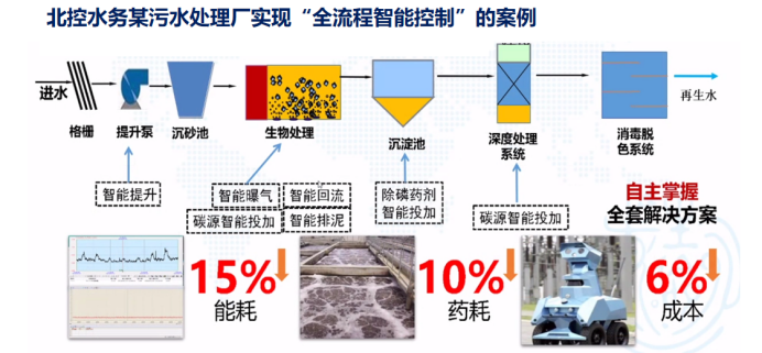 北控水务发布了“污水厂数字双胞胎”概念版,以实际水厂为蓝本,整合静态数据、动态数据和生产管理数据,通过机理模型分析和大数据分析等方法,将水厂过去、现在和未来的状态进行直观的呈现和预测,并结合专家系统提出建议,为运营管理提供决策支持,并实现高度保障、管理高效、成本优化和产能挖潜的目的。为实现北控水务高效卓越运营管理提供了支撑,通过全流程的智能化控制,北控水务运行的很多水厂实现了节能降耗,实现了整体成本的降低。