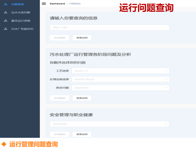 下图是运行问题查询界面,收集的经验和各种资料,包括污水处理厂运行管理各阶段的问题,可以通过查询关键词获得。