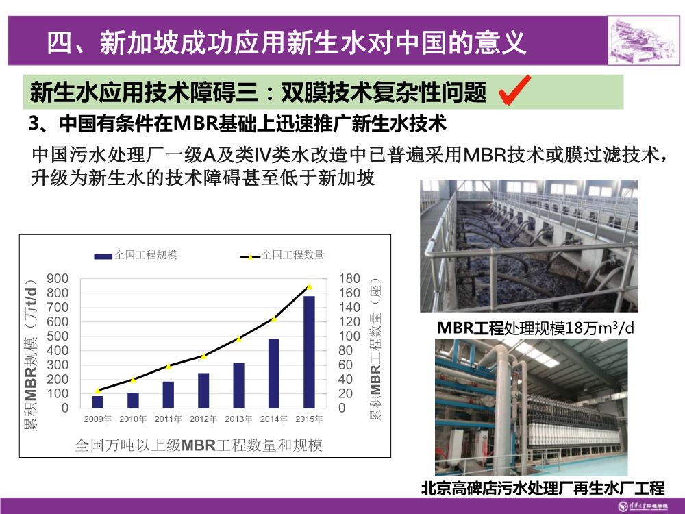 新加坡正在规划和发展的下一代NEWater生产工艺,是通过MBR取代活性污泥+二沉池+超滤膜的现有工艺。不仅仅需要建设双膜法的新生水厂,下一步还要改造污水处理厂,因此对其是复杂的任务。但是在在中国,我们在一级A改造过程中大量使用了膜过滤和MBR,很多采用MBR,总数在全国MBR已经超过了上千万吨,膜过滤也在两千万吨以上。特别是北京、天津等大城市采用了准IV类水的标准,MBR在生活污水厂的应用已经比较广泛,只需要在后段再加上RO就可以生产高品质再生水,从已经采用MBR或膜过滤的污水处理厂升级到高品质再生水厂的投资成本较低。所以对我们国家现节这些厂的应用来讲,应该是水到渠成,应用的广泛性就会非常大,有非常现实的意义。