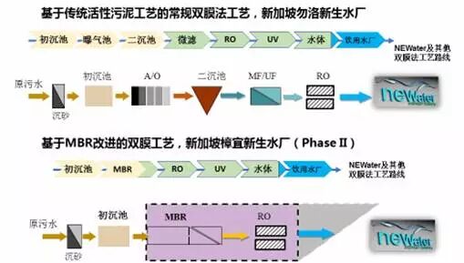 在传统二级处理的基础上,”臭氧+活性炭过滤“工艺和”超滤+反渗透“双膜工艺是最常用的两条高品质再生水处理技术路线。反渗透工艺的概念最早起源于美国21世纪水厂,之后在新加坡发扬光大,成为解决区域水资源问题的“利器”。新加坡第一座NEWater(新生水)处理厂在2002年建成,樟宜二期水厂被认为是第二代NEWater主力工艺,二级处理未来计划采用MBR工艺,这也是解决系统复杂性的一次尝试。