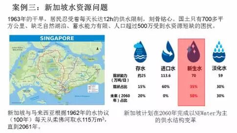 在如何利用高品质再生水解决水资源问题上,新加坡给了我国非常正面的启示。由于新加坡水资源长期受制于马来西亚,新加坡决定通过增加非传统水资源如海水淡化及污水回用、雨水利用等措施彻底解决水资源问题。他们的目标是到2060年水资源完全不依赖外部供给,其中新生水用量可以达到55%,从而彻底解决新加坡水资源的危机问题。新加坡的经验告诉我们,人类在水资源利用上是可以有所作为的,关键是怎么来做。