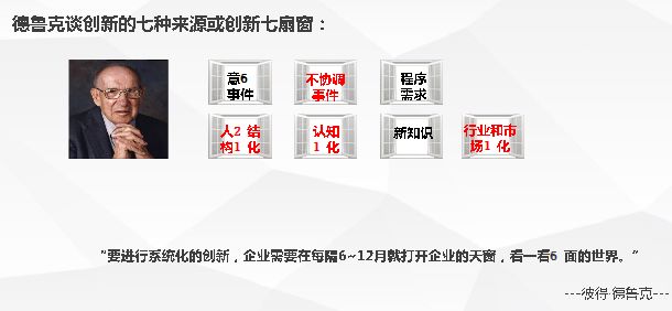 德鲁克提出,创新有七种来源,被称之为创新七扇窗,包括意外事件、不协调事件、程序需求、人口结构变化、认知变化、新知识、行业和市场变化等,他表示,要进行系统化的创新,企业需要在每隔半年到一年就打开企业的天窗,看一看外面的世界。