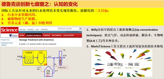 创新的第三扇窗是认知的变化。以前污水处理更多的想去除污染,现在,国际上公认针对未来的污水处理技术要实现资源化、能源化,实现污水中水资源回用、碳源物质生产能源、营养元素(磷、氮)回收利用等三大目标,这是认知的变化。这个变化,仿佛打开了潘多拉的魔盒,给了我们无限的可能,需要时间去创新。