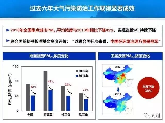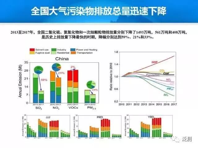 众所周知,过去五年当中“大气十条”有了非常好的基础,这个基础就是全国各类污染物的排放量在迅速下降。美国同行经常以1980-2018年间不断累计的喇叭口式的图表做分析:上面是各类经济指标、社会发展指标,中间是能耗指标,下面是污染物指标。从2010年以后,我们把中国大气污染治理也画了一个图,中国正在形成目前这样的发展趋势。其中GDP是红线,二氧化硫是绿线,可以看出二氧化硫减排是最明显的,这个喇叭口也正在形成。喇叭口越大,说明以后的高质量发展特别在蓝天上面的体现就越充分。