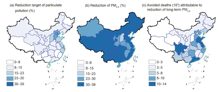 图1. 我国PM2.5 浓度改善目标、2013-2017年PM2.5浓度改善情况及相应避免的长期暴露导致的过早死亡人数(Xue, T., et al., 2019)
