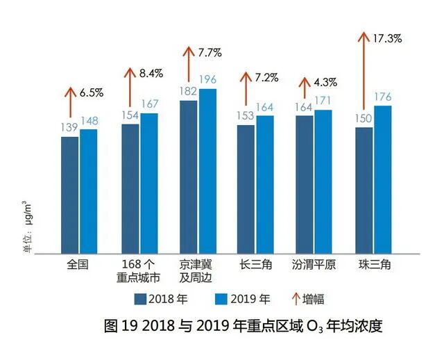 自2013年环境部门发布臭氧数据以来,全国臭氧污染浓度水平一直处于上升趋势。2019年,全国337个城市的臭氧平均浓度同比涨幅6.5%,其中珠三角、长三角、京津冀及周边等重点区域的涨幅更为显著,且年均浓度均超标。
