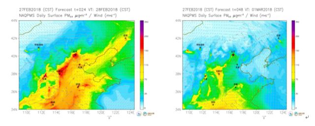 因东北高压系统南下受阻,27日白天冷空气过程显著偏弱,京津冀中部污染过程预计将持续至28日。受区域性弱风、高湿及逆温等不利气象条件影响,京津冀中南部、山西南部、山东西部和河南北部可能出现中至重度污染过程,影响范围主要包括北京、天津、石家庄、保定、衡水、邢台、邯郸、晋城、济南、德州、淄博、聊城、郑州、安阳、鹤壁、焦作、新乡、濮阳等城市,部分城市可能达到严重污染,PM2.5小时浓度峰值可能达到或超过350微克/立方米。28日夜间至3月1日凌晨,受冷空气过程影响,包括北京、天津在内的京津冀中部城市群空气质量有望改善(图9)。