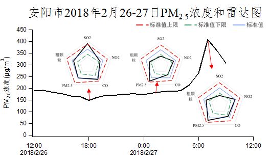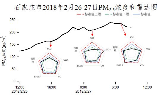 图7 石家庄、安阳2月26-27日PM2.5浓度和雷达图