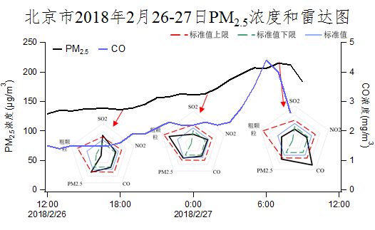 图5 北京市2月26-27日雷达图及东部通道CO浓度变化