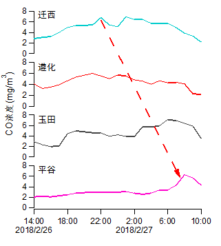 本次重污染过程中,从唐山到北京一线的CO浓度伴随PM2.5存在明显的快速增加,北京2月27日4时之前CO维持在2.2-2.3 mg/m3,5-9时迅速上升至2.6-4.4 mg/m3。从迁西-遵化-玉田-平谷(沿主导风向)各监测点位的时序变化也可以看出,CO沿传输方向峰值明显呈依次出现的特征。污染物特征雷达图也显示,北京在此次污染过程中CO呈现相对很高的特征。以上证据表明,北京市的污染明显受到了来自东部地区的传输影响(图5)。