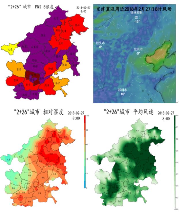 2018年2月26日起,京津冀及周边地区经历了一次重污染过程,主要集中在河北南部、河南北部和山东西北部地区,其中沧州、衡水、邢台、邯郸、安阳等城市污染较严重。截止2月27日8时,京津冀及周边地区“2+26”城市有23个城市PM2.5小时浓度先后超过150微克/立方米(日均值重污染标准);其中,有5个城市PM2.5小时浓度超过250微克/立方米(日均值严重污染标准)。区域内PM2.5小时浓度最高值出现在安阳,2月27日7时达到408微克/立方米;北京市PM2.5小时浓度过程高值同样出现在2月27日7时,达到215微克/立方米(图1)。