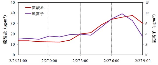 同时,26日夜间北京市PM2.5中硫酸盐组分浓度快速上升,27日早晨硫酸盐质量浓度高达约40微克/立方米,占PM2.5总质量的20%左右,氯离子浓度也呈现同步增长趋势,结合上述分析,指示了区域燃煤污染传输的影响;再叠加本地机动车等污染源排放的累积,北京市PM2.5浓度快速上升,在27日凌晨至上午达到重污染水平(图6)。
