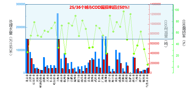 根据我们的计算我国36个重点城市,其中有25个的COD漏损率超过50%,这直接导致我们过于乐观地估计了我们的污水处理率,实际上可能有50%以上污水没有接入到管网,这是最主要的一个问题。