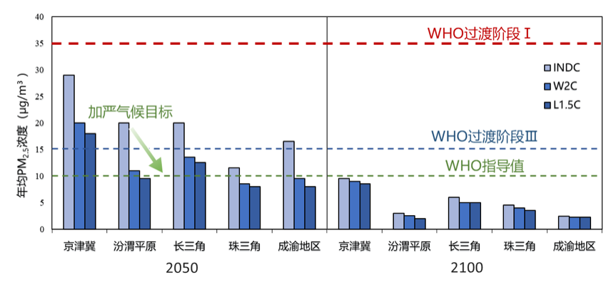图3. 气候政策驱动下2050年和2100年重点地区PM2.5年均浓度