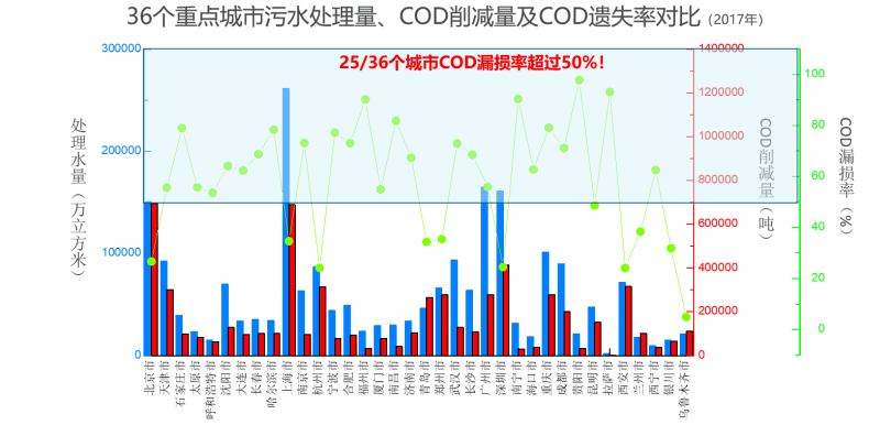 王凯军总结,尽管我国污水处理量大,但进水污染物浓度低,导致各地的污水处理率虚高。将36个重点城市污水处理量、COD削减量及COD遗失率对比发现,其中25个城市COD漏损率超过50%!这一现象背后的原因按目前低浓度情况,按用水量区分,有以下三种情况:1、如果水量小,说明用水浪费,并且管网建设落后;2、如水量相当,说明有一半以上污水没有收集,并且雨污不分;3、如果水量大,说明污水没有收集或管网破损严重。