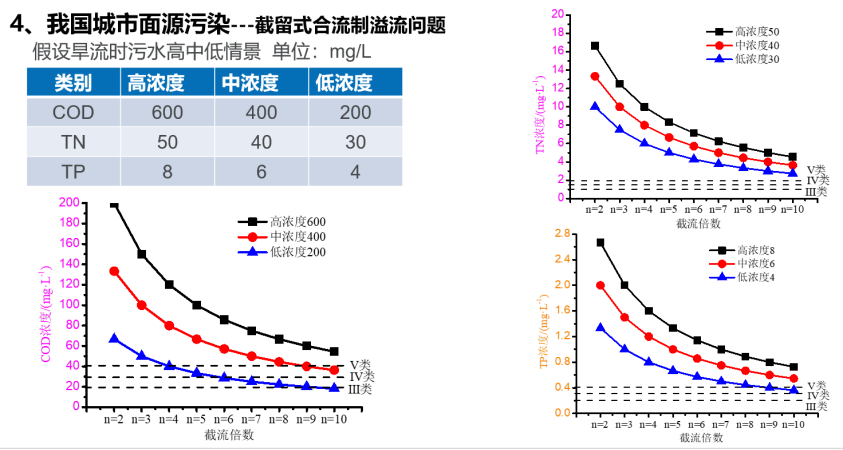 根据研究表明,初期雨水污染物浓度高于污水厂排放标准,混合雨水污染物浓度也不能满足水环境要求。我国下一步将采取更大倍数截流标准,然而根据《室外排水设计规范》3.3.3条款中截流倍数宜采用2~5的要求,甚至采用10倍截留率,以Ⅲ类水、Ⅳ类水标准来看,溢流污水浓度也不能满足水环境的要求,氮、磷这部分仍然超标。
