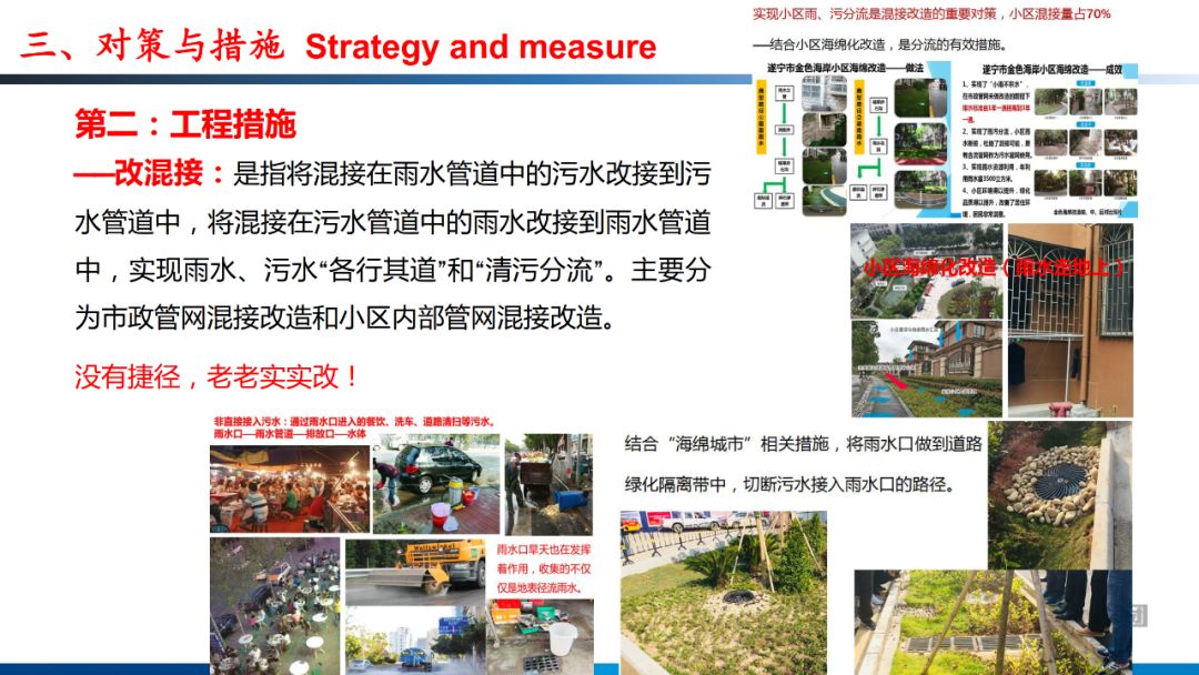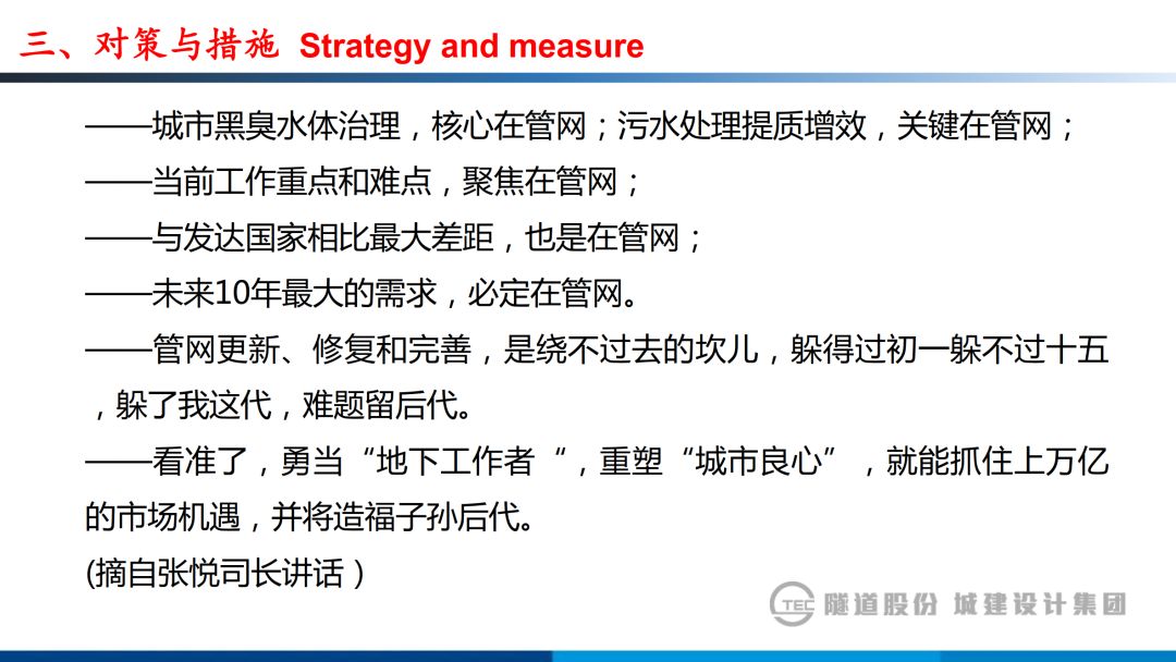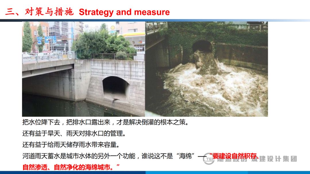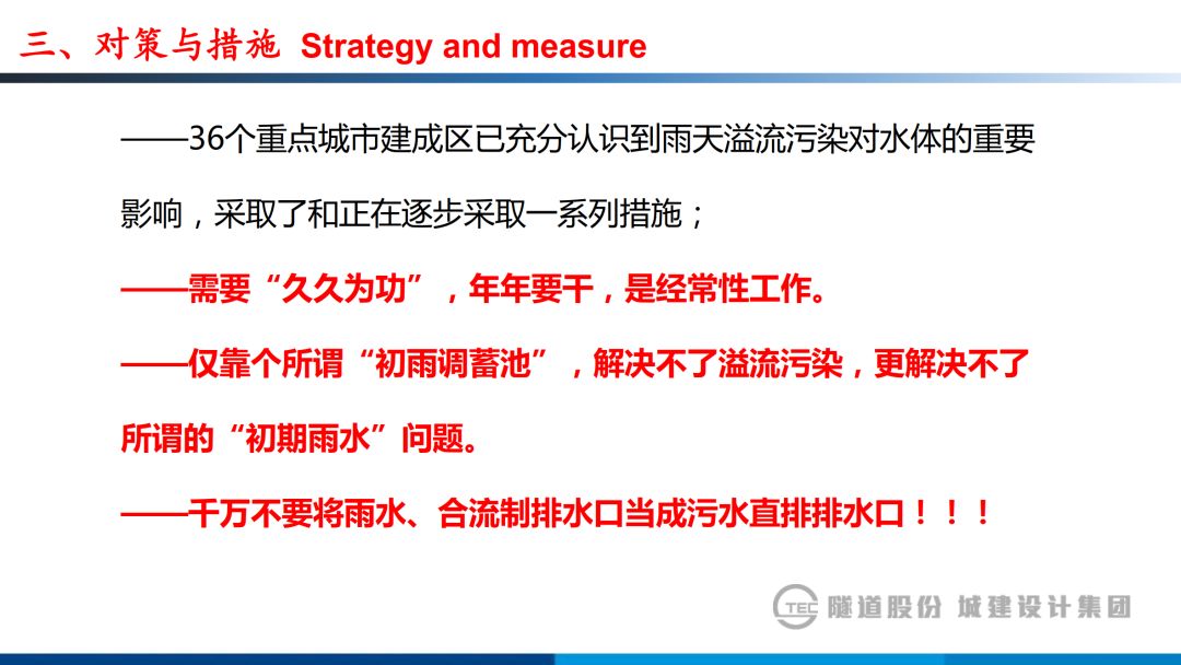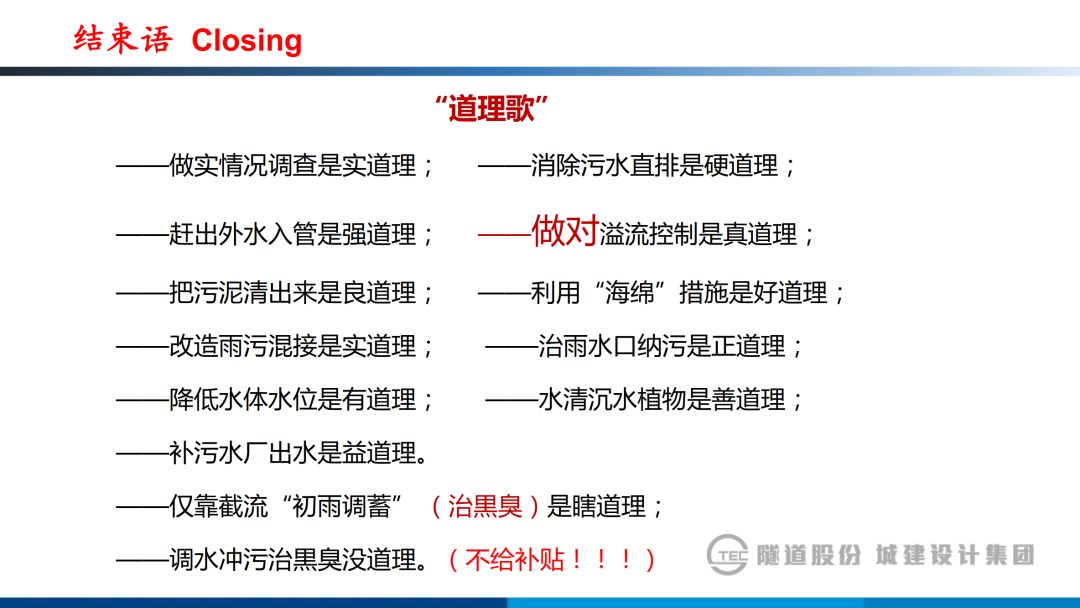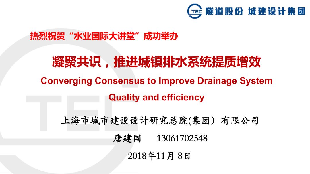 本次活动的主办单位之一——上海市城市建设设计研究总院(集团)有限公司唐建国总工做了“凝聚共识,推进城镇排水系统提质增效”的主题发言,主要介绍了近期中央和国家对排水系统建设、设计、普查、养护、维修、管理等方面在制度上的要求,以及在实际运行管理中的措施和策略。特别把唐总的“道理歌”进行分享:做实情况调查是实道理,消除污水直排是硬道理。赶出外水入管是强道理,做对溢流控制是真道理。把污泥清出来是良道理,利用海绵措施是好道理。改造雨污混接是对道理,治雨水口纳污是正道理。降低水体水位是有道理,水清沉水植物是善道理,补污水厂出水是益道理,截流初雨调蓄(治黑臭)是瞎道理,调水冲污治黑臭没道理。